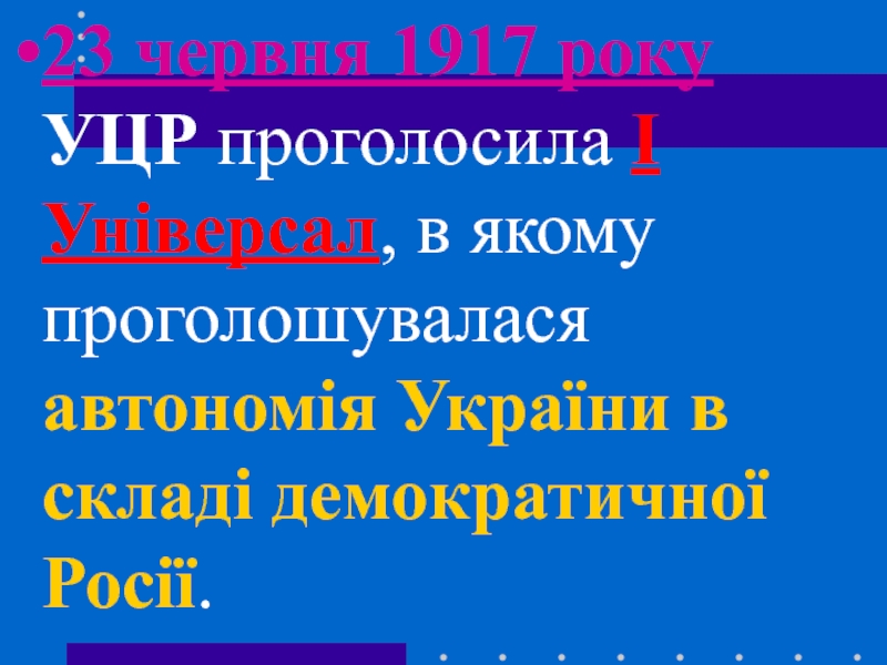Слайд 2823 червня 1917 року УЦР проголосила I Універсал, в якому