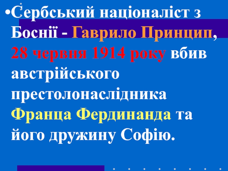 року вбив австрійського престолонаслідника Франца Фердинанда та його дружину Софію.