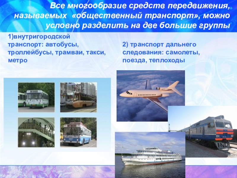 Все многообразие средств передвижения, называемых «общественный транспорт», можно условно разделить на две большие группы1)внутригородской транспорт: автобусы, троллейбусы, трамваи, такси, метро2) транспорт дальнего следования: самолеты, поезда, теплоходы