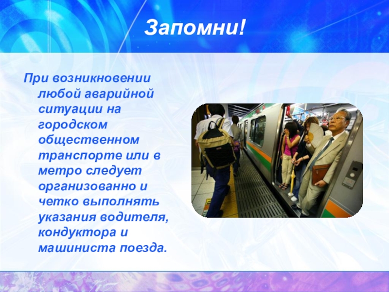 Запомни!При возникновении любой аварийной ситуации на городском общественном транспорте или в метро следует организованно и четко выполнять