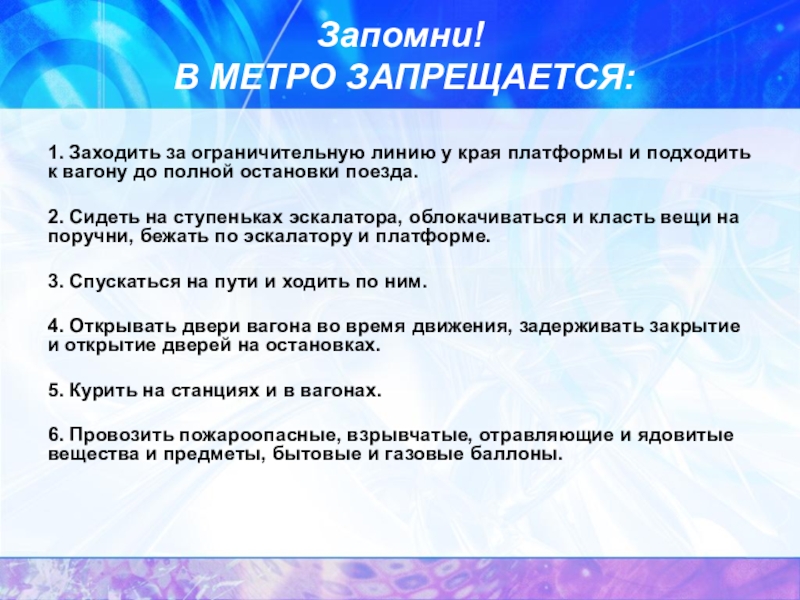 Слайд 7Запомни! В МЕТРО ЗАПРЕЩАЕТСЯ: