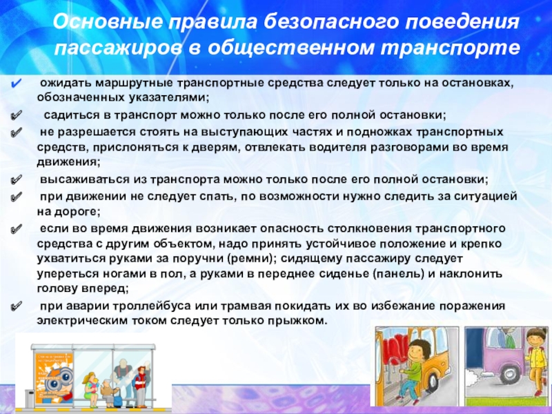 Основные правила безопасного поведения пассажиров в общественном транспорте   ожидать маршрутные транспортные средства следует только