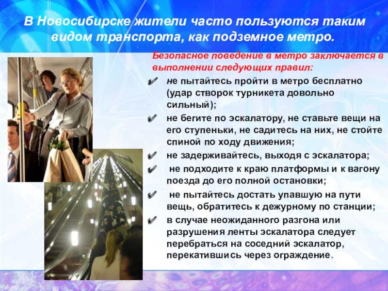 В Новосибирске жители часто пользуются таким видом транспорта, как подземное метро. Безопасное поведение в метро заключается в