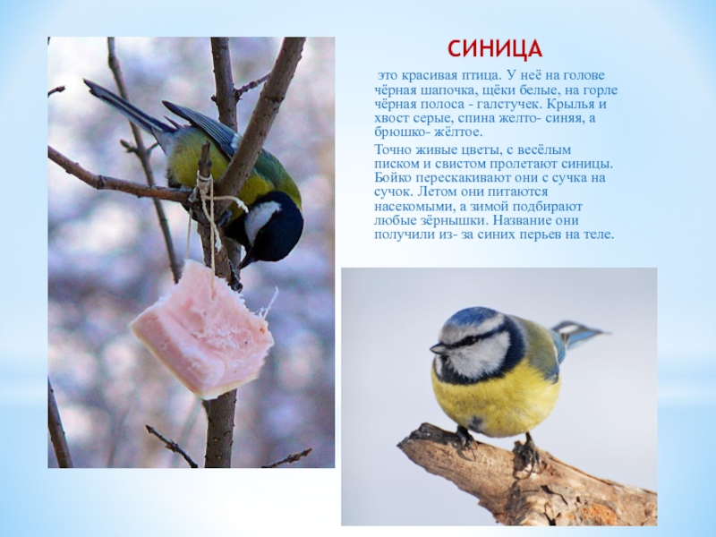 Точно живые цветы, с весёлым писком и свистом пролетают синицы. Бойко перескакивают они с сучка на сучок. Летом они питаются насекомыми, а зимой подбирают любые зёрнышки. Название они получили из- за синих перьев на теле.