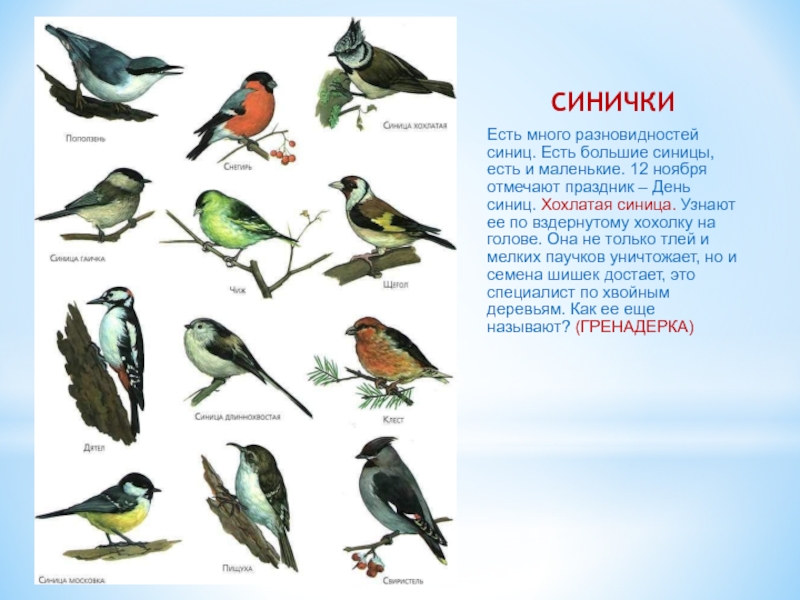 отмечают праздник – День синиц. Хохлатая синица. Узнают ее по вздернутому хохолку на голове. Она не только тлей и мелких паучков уничтожает, но и семена шишек достает, это специалист по хвойным деревьям. Как ее еще называют? (ГРЕНАДЕРКА)