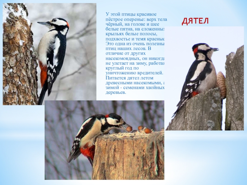 подхвостье и темя красные. Это одна из очень полезных птиц наших лесов. В отличие от других насекомоядных, он никогда не улетает на зиму, работая круглый год по уничтожению вредителей. Питается дятел летом древесными насекомыми, а зимой - семенами хвойных деревьев.