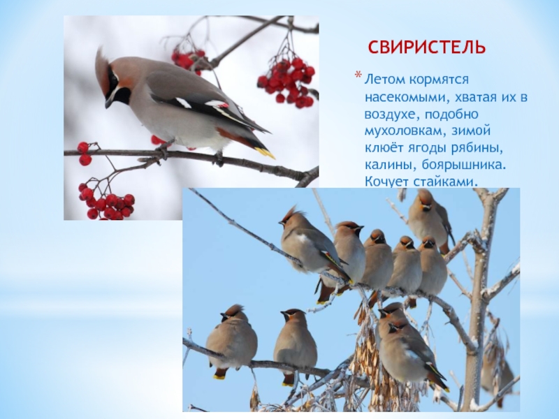 клюёт ягоды рябины, калины, боярышника. Кочует стайками.