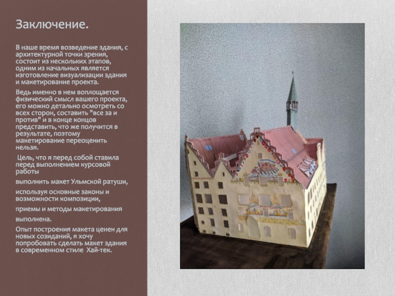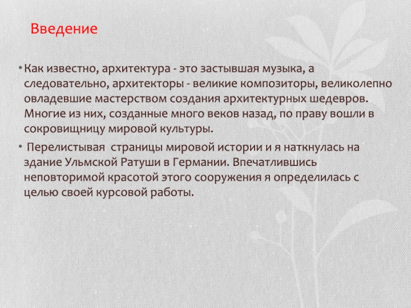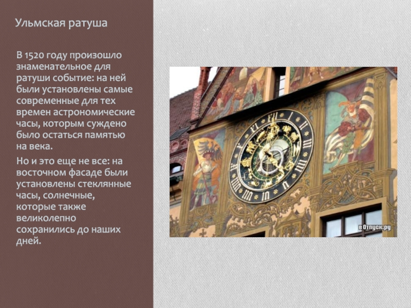 Перелистывая страницы мировой истории и я наткнулась на здание Ульмской Ратуши в Германии. Впечатлившись неповторимой красотой этого сооружения я определилась с целью своей курсовой работы.