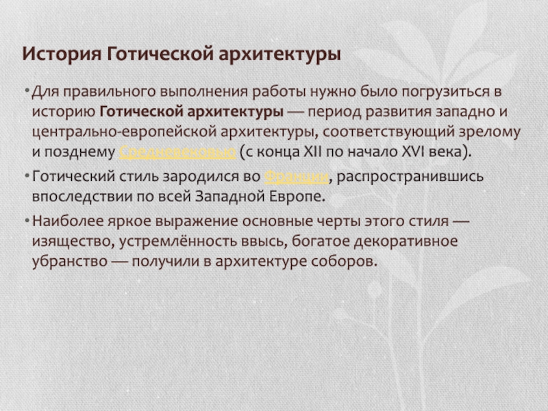 историю Готической архитектуры — период развития западно и центрально-европейской архитектуры, соответствующий