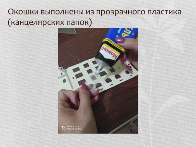 Слайд 13Окошки выполнены из прозрачного пластика (канцелярских папок)