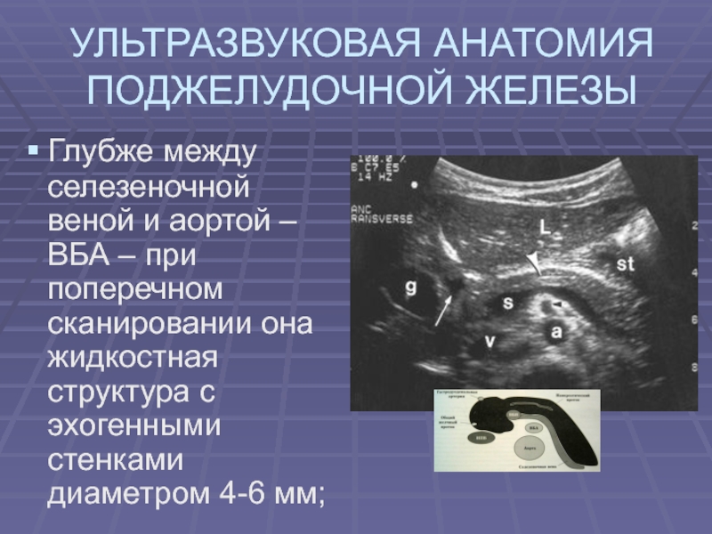 Слайд 10УЛЬТРАЗВУКОВАЯ АНАТОМИЯ ПОДЖЕЛУДОЧНОЙ ЖЕЛЕЗЫ