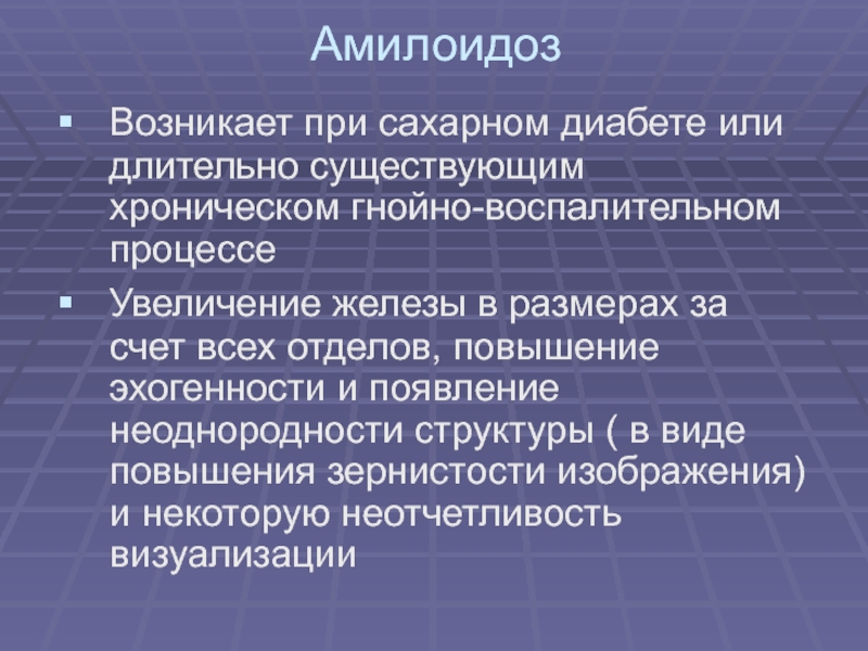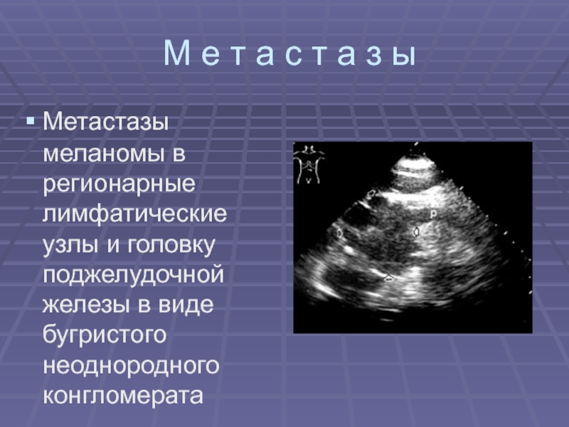 дает меланома - множественные полиморфные изо- и гипоэхогенные участки, инфильтрирующие ткань железы наподобие диффузной формы рака поджелудочной железы, а метастазы рака желудка не отличаются от первичного узлового поражения