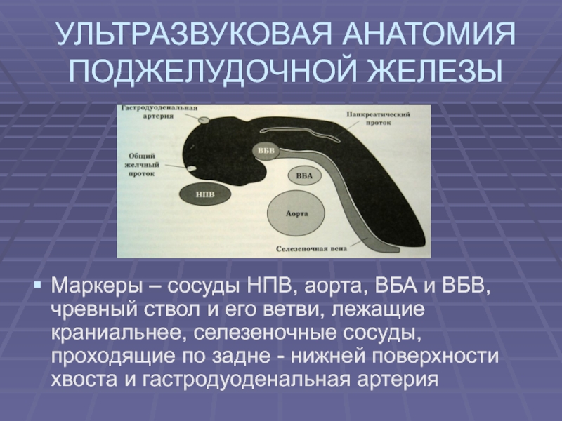 Слайд 19УЛЬТРАЗВУКОВАЯ АНАТОМИЯ ПОДЖЕЛУДОЧНОЙ ЖЕЛЕЗЫ