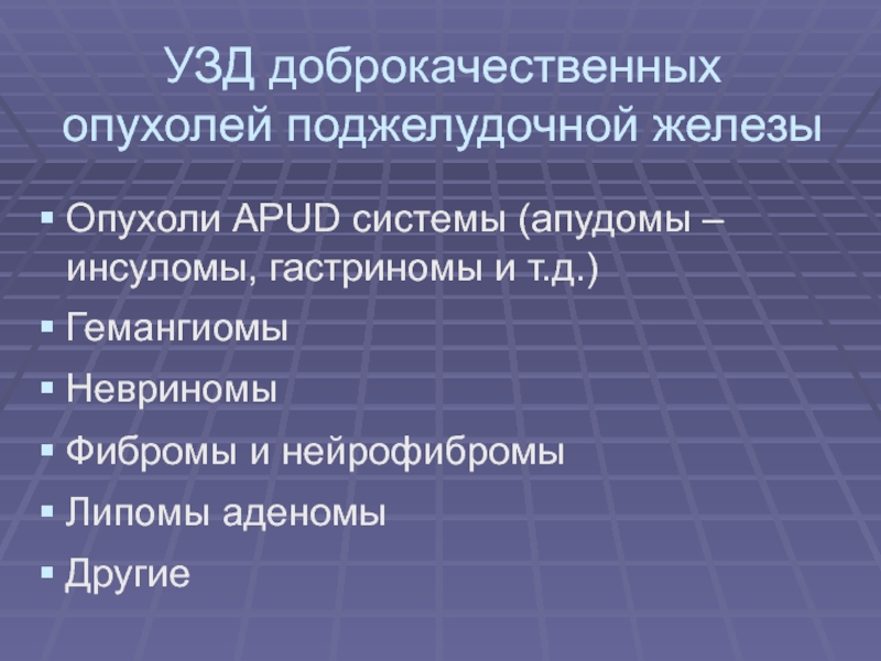 Слайд 114УЗД доброкачественных опухолей поджелудочной железы