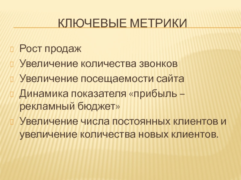 Ключевые метрикиРост продажУвеличение количества звонковУвеличение посещаемости сайтаДинамика показателя «прибыль – рекламный бюджет»Увеличение числа постоянных клиентов и увеличение