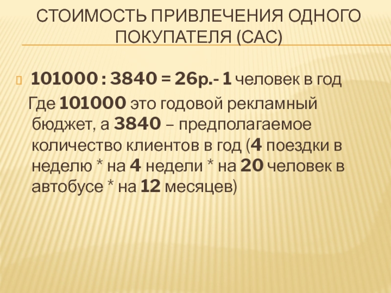 Стоимость привлечения одного покупателя (Сас)101000 : 3840 = 26р.- 1 человек в год  Где 101000 это