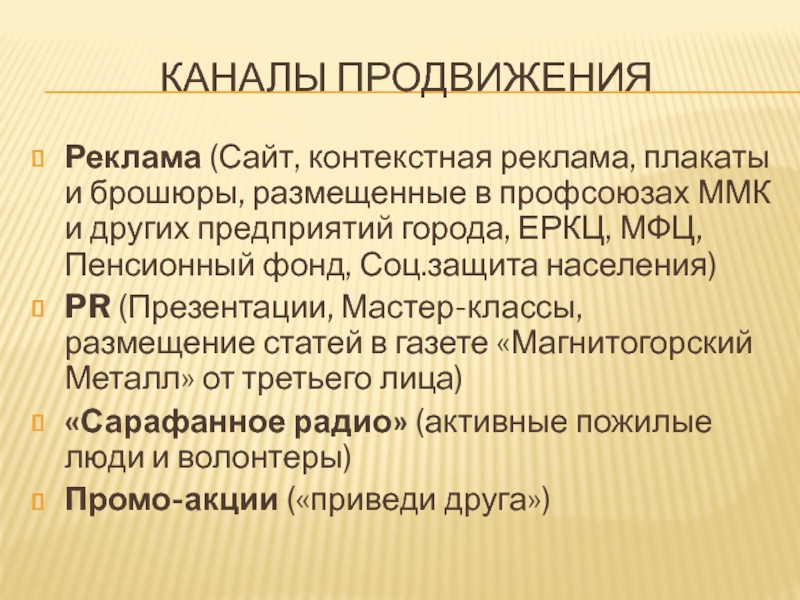 Каналы продвиженияРеклама (Сайт, контекстная реклама, плакаты и брошюры, размещенные в профсоюзах ММК и других предприятий города, ЕРКЦ,