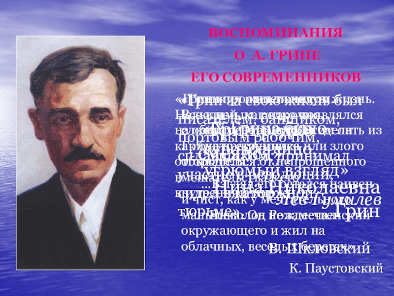«Грин жил отшельником. Нелюдимым, редко появлялся на общих сборищах. Этим он как будто стремился отгородиться от непрошенного вмешательства в его внутренний мир».