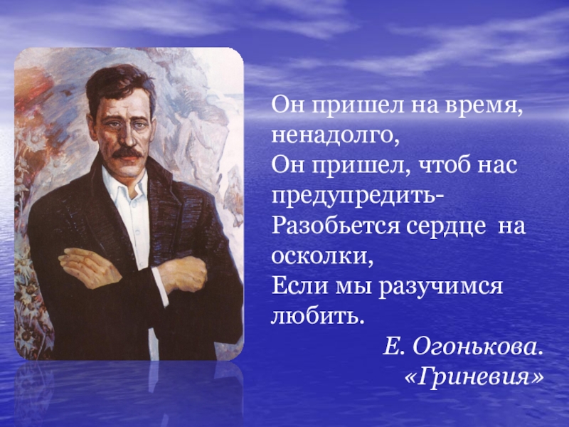 …Взгляд его остался наивен и чист, как у мечтательного мальчика. Он не замечал окружающего и жил на облачных, веселых берегах»