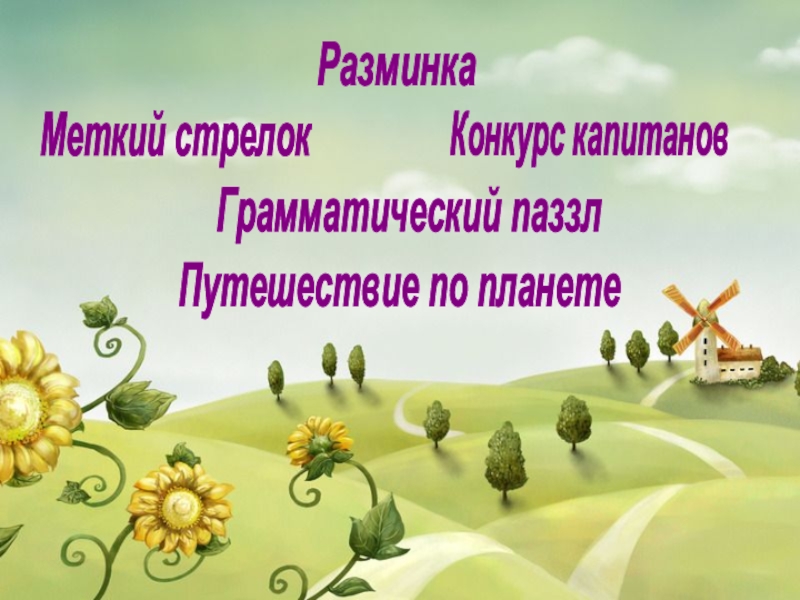 РазминкаМеткий стрелокКонкурс капитановГрамматический паззлПутешествие по планете
