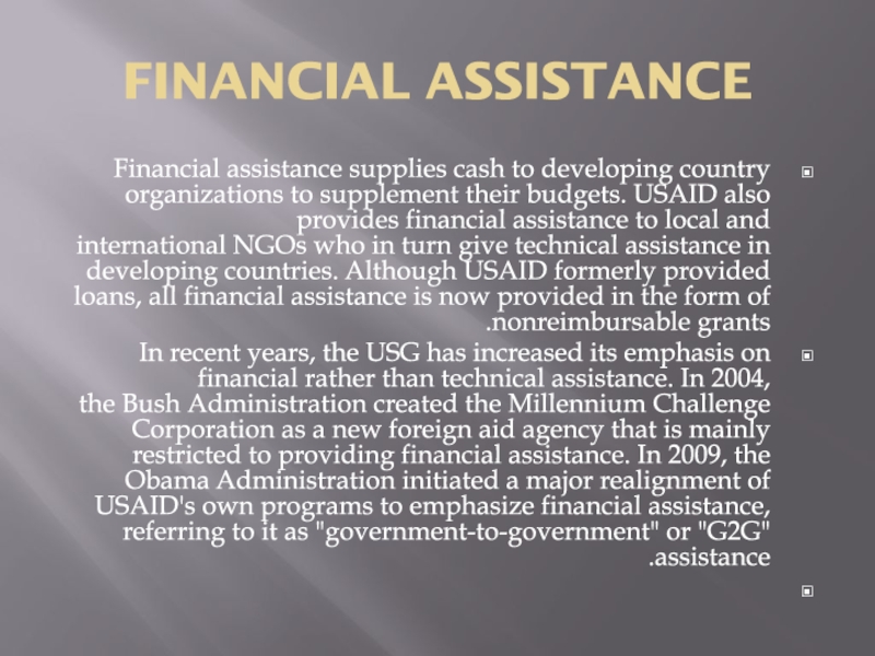 and international NGOs who in turn give technical assistance in developing countries. Although USAID formerly provided loans, all financial assistance is now provided in the form of nonreimbursable grants.