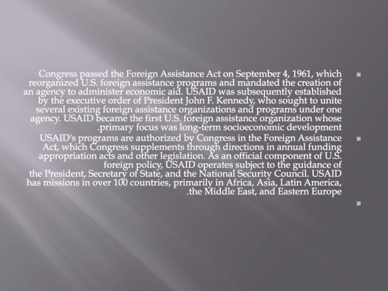 Слайд 3Congress passed the Foreign Assistance Act on September 4, 1961, which reorganized