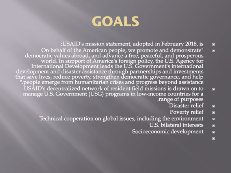 USAID's mission statement, adopted in February 2018, is: