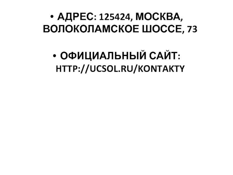 Слайд 8АДРЕС: 125424, МОСКВА, ВОЛОКОЛАМСКОЕ ШОССЕ, 73