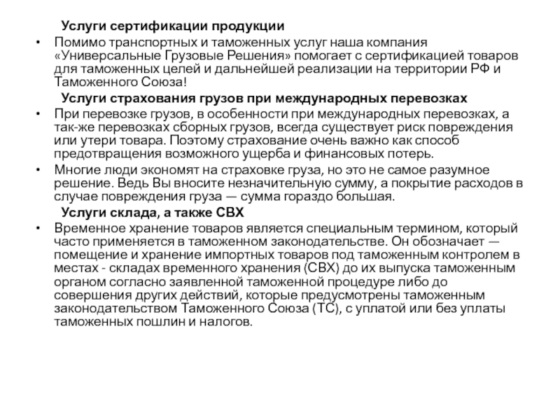 Помимо транспортных и таможенных услуг наша компания «Универсальные