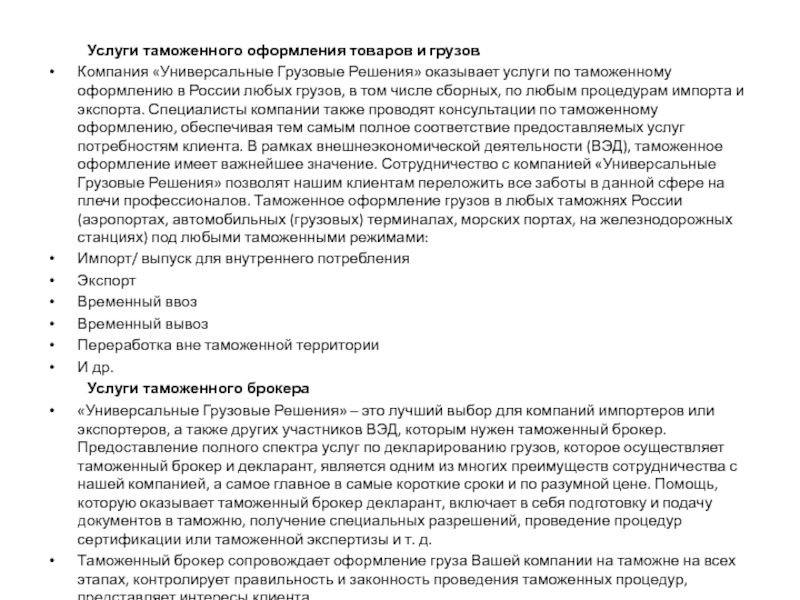 числе сборных, по любым процедурам импорта и экспорта. Специалисты компании также проводят консультации по таможенному оформлению, обеспечивая тем самым полное соответствие предоставляемых услуг потребностям клиента. В рамках внешнеэкономической деятельности (ВЭД), таможенное оформление имеет важнейшее значение. Сотрудничество с компанией «Универсальные Грузовые Решения» позволят нашим клиентам переложить все заботы в данной сфере на плечи профессионалов. Таможенное оформление грузов в любых таможнях России (аэропортах, автомобильных (грузовых) терминалах, морских портах, на железнодорожных станциях) под любыми таможенными режимами: