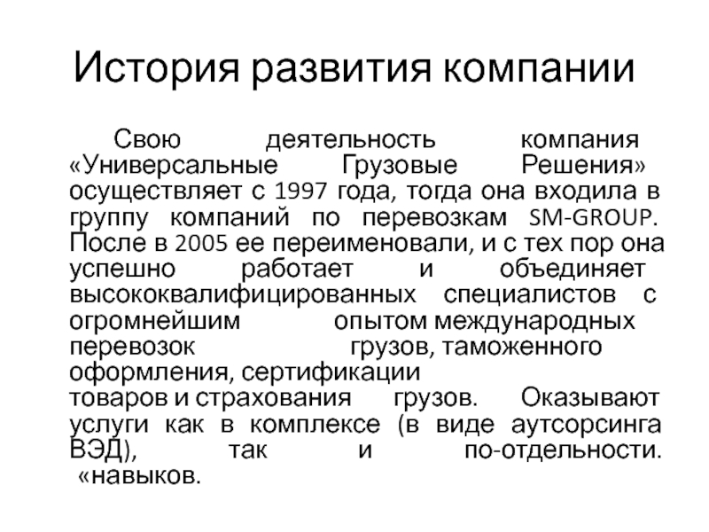 SM-GROUP. После в 2005 ее переименовали, и с тех пор она успешно работает и объединяет высококвалифицированных специалистов с огромнейшим опытом международных перевозок грузов, таможенного оформления, сертификации товаров и страхования грузов. Оказывают услуги как в комплексе (в виде аутсорсинга ВЭД), так и по-отдельности.
