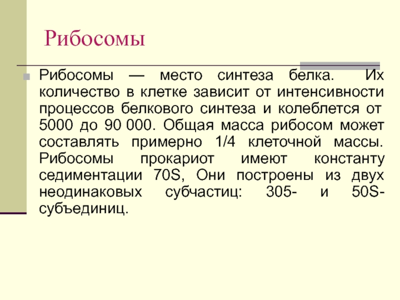 90 000. Общая масса рибосом может составлять примерно 1/4 клеточной массы. Рибосомы прокариот имеют константу седиментации 70S, Они построены из двух неодинаковых субчастиц: 305- и 50S-субъединиц.