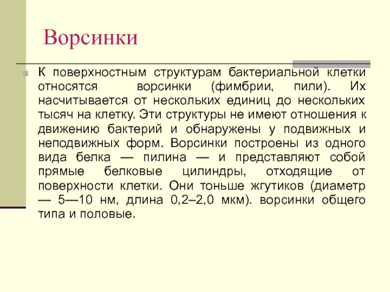 структуры не имеют отношения к движению бактерий и обнаружены у подвижных и неподвижных форм. Ворсинки построены из одного вида белка — пилина — и представляют собой прямые белковые цилиндры, отходящие от поверхности клетки. Они тоньше жгутиков (диаметр — 5—10 нм, длина 0,2–2,0 мкм). ворсинки общего типа и половые.