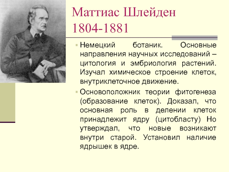 (образование клеток). Доказал, что основная роль в делении клеток принадлежит ядру (цитобласту) Но утверждал, что новые возникают внутри старой. Установил наличие ядрышек в ядре.