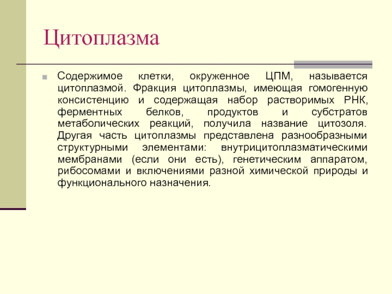 Содержимое клетки, окруженное ЦПМ, называется цитоплазмой. Фракция цитоплазмы, имеющая гомогенную