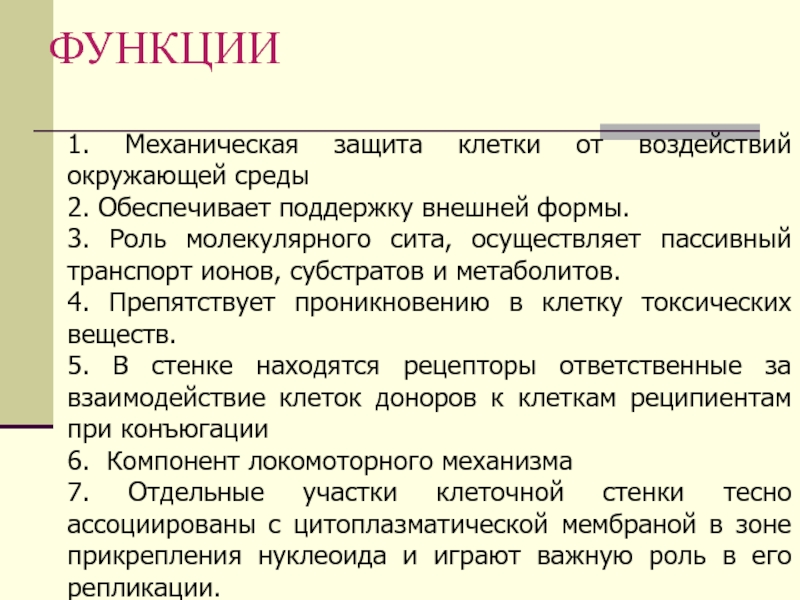 7. Отдельные участки клеточной стенки тесно ассоциированы с цитоплазматической мембраной в зоне прикрепления нуклеоида и играют важную роль в его репликации.