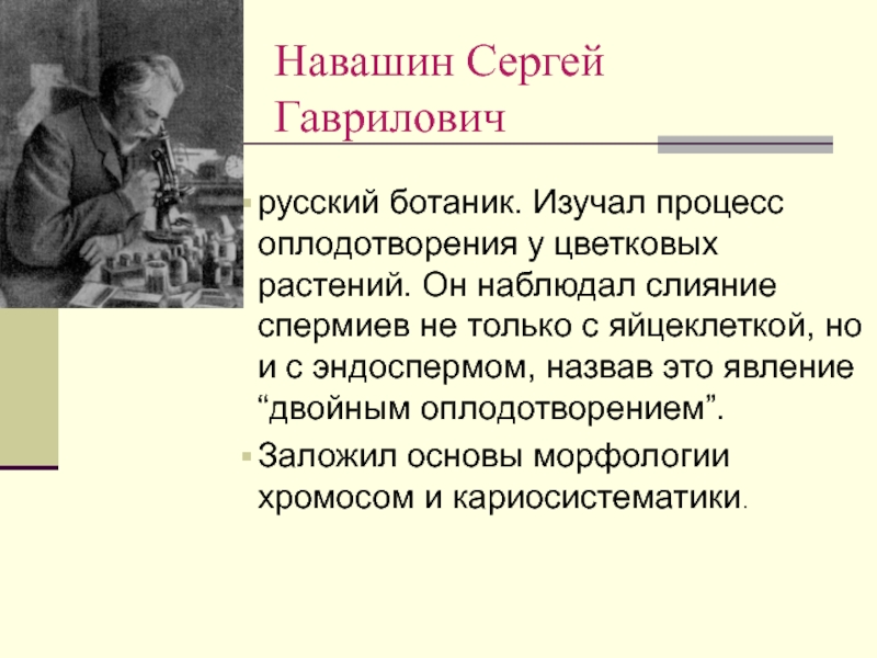 русский ботаник. Изучал процесс оплодотворения у цветковых растений.