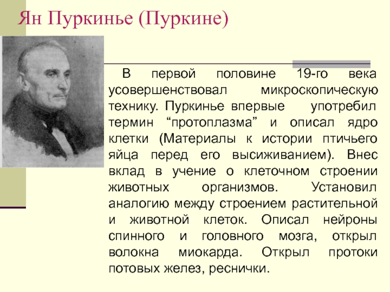 “протоплазма” и описал ядро клетки (Материалы к истории птичьего яйца перед его высиживанием). Внес вклад в учение о клеточном строении животных организмов. Установил аналогию между строением растительной и животной клеток. Описал нейроны спинного и головного мозга, открыл волокна миокарда. Открыл протоки потовых желез, реснички.