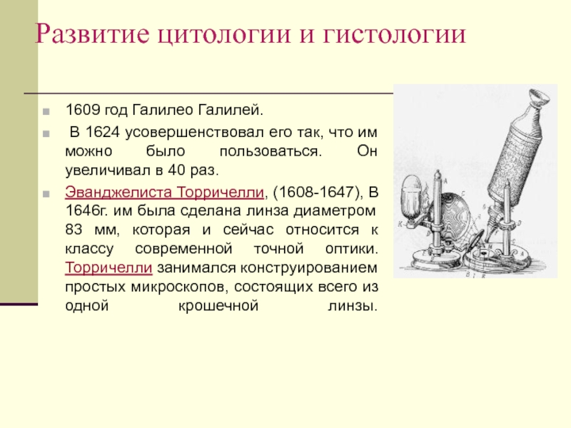 Эванджелиста Торричелли, (1608-1647), В 1646г. им была сделана линза диаметром 83 мм, которая и сейчас относится к классу современной точной оптики. Торричелли занимался конструированием простых микроскопов, состоящих всего из одной крошечной линзы.