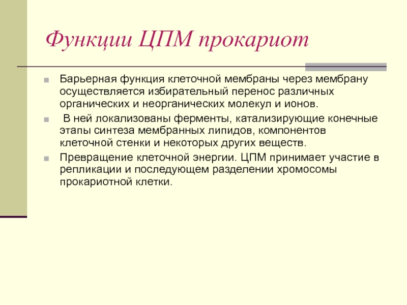 Превращение клеточной энергии. ЦПМ принимает участие в репликации и последующем разделении хромосомы прокариотной клетки.