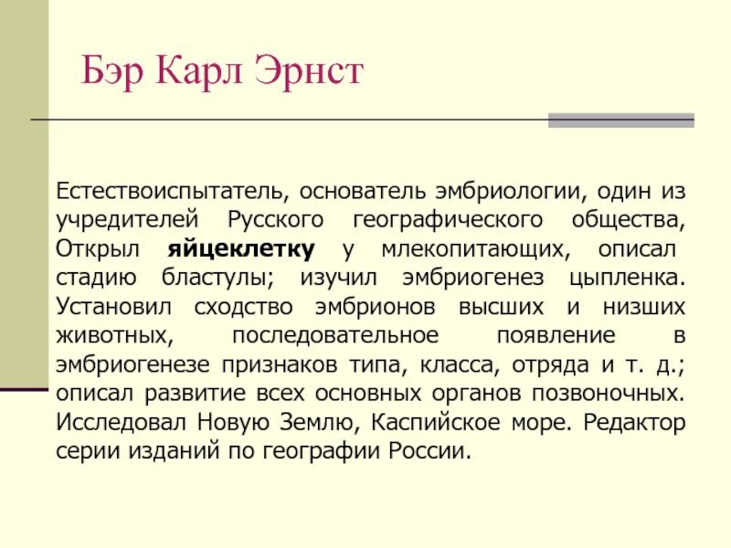 цыпленка. Установил сходство эмбрионов высших и низших животных, последовательное появление в эмбриогенезе признаков типа, класса, отряда и т. д.; описал развитие всех основных органов позвоночных. Исследовал Новую Землю, Каспийское море. Редактор серии изданий по географии России.