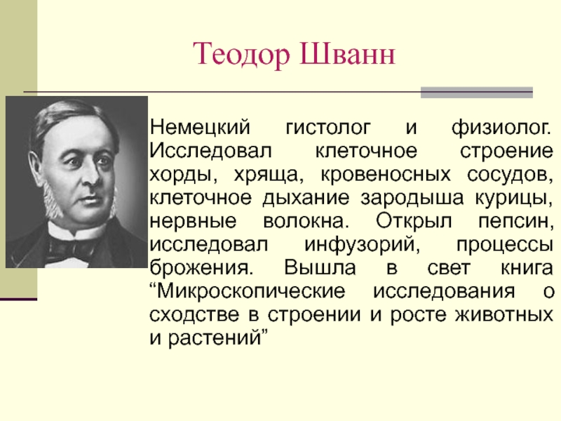 исследовал инфузорий, процессы брожения. Вышла в свет книга “Микроскопические исследования о сходстве в строении и росте животных и растений”