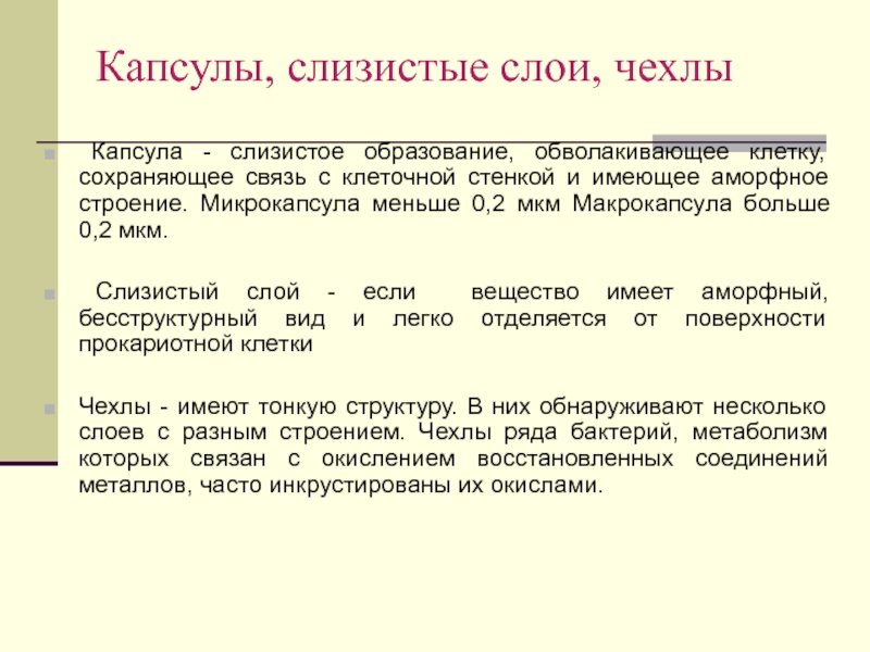 Чехлы - имеют тонкую структуру. В них обнаруживают несколько слоев с разным строением. Чехлы ряда бактерий, метаболизм которых связан с окислением восстановленных соединений металлов, часто инкрустированы их окислами.