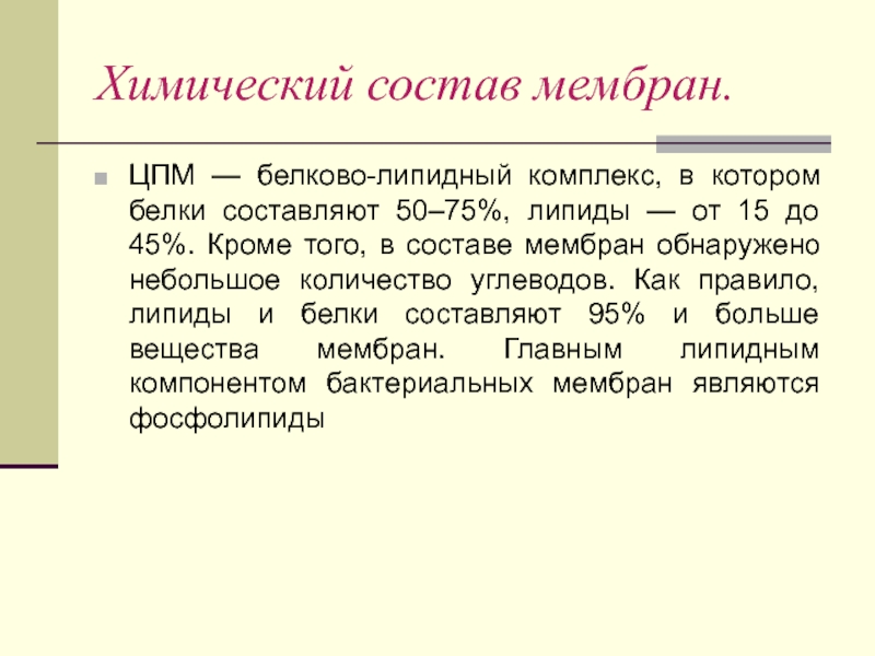 составе мембран обнаружено небольшое количество углеводов. Как правило, липиды и белки составляют 95% и больше вещества мембран. Главным липидным компонентом бактериальных мембран являются фосфолипиды