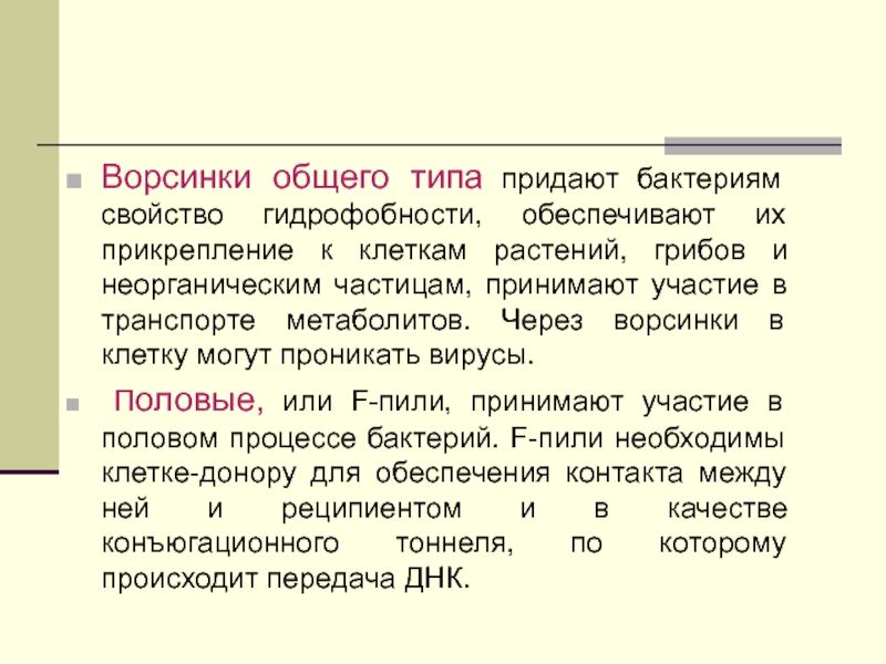 Слайд 69Ворсинки общего типа придают бактериям свойство гидрофобности, обеспечивают их прикрепление