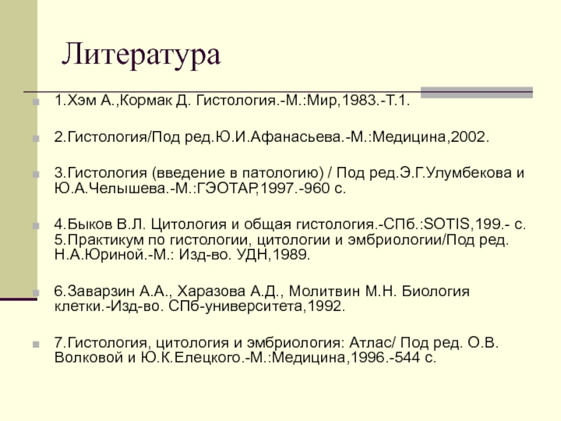 1.Хэм А.,Кормак Д. Гистология.-М.:Мир,1983.-Т.1.