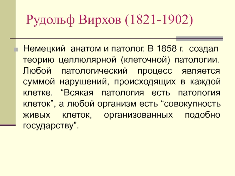 происходящих в каждой клетке. “Всякая патология есть патология клеток”, а любой организм есть “совокупность живых клеток, организованных подобно государству”.