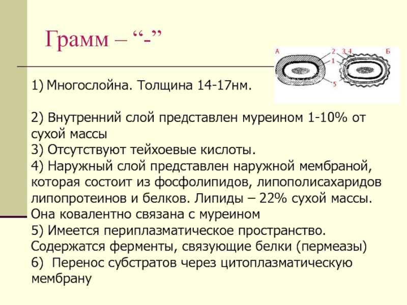 5) Имеется периплазматическое пространство. Содержатся ферменты, связующие белки (пермеазы)