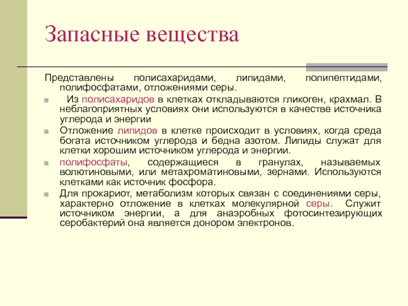 Представлены полисахаридами, липидами, полипептидами, полифосфатами, отложениями серы.