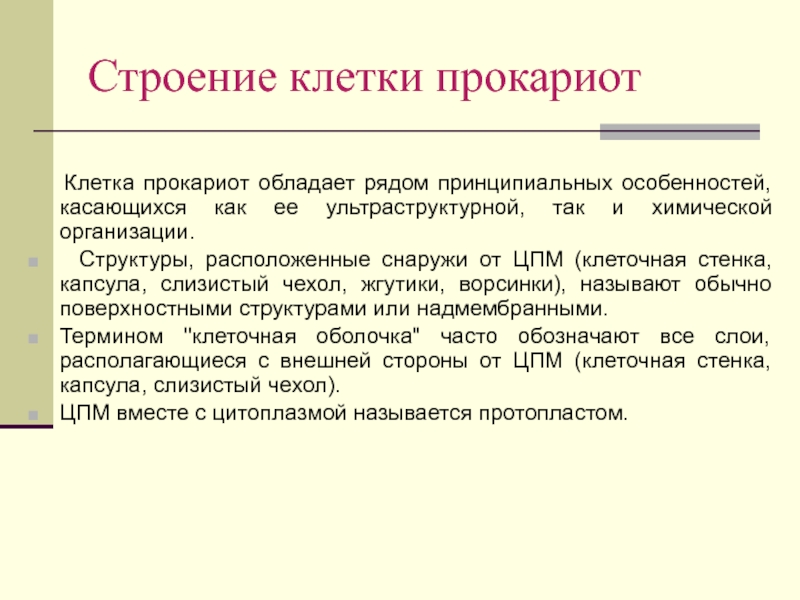 Содержимое клетки отделяется от клеточной стенки цитоплазматической мембраной (ЦПМ) —